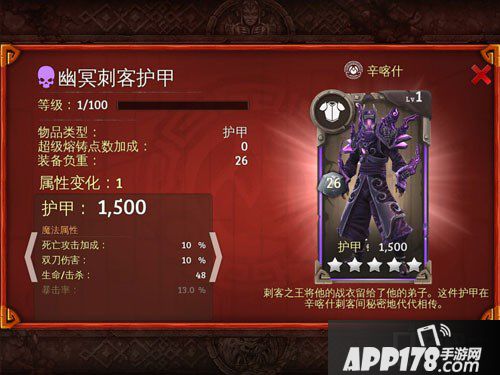 护甲介绍:刺客之王将他的战衣留给他的弟子,这件护甲在辛喀什此刻见秘密的代代相传。