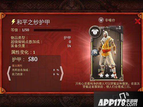 护甲介绍:只有心灵最纯净的僧人才可以穿戴这种服装,在首次穿戴这种服装前,僧人们会斋戒三日。。