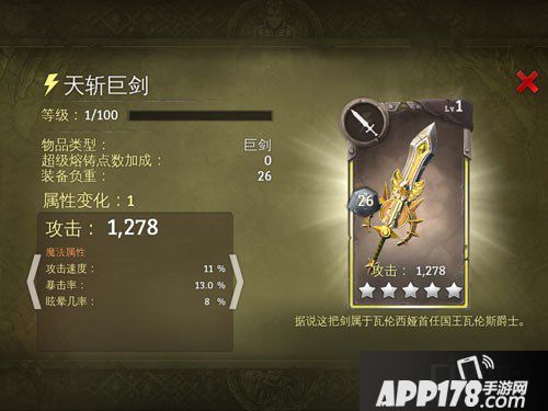 地牢猎手5光明属性天斩巨剑图鉴!地牢猎手5是一款非常好玩的手机游戏,在这款游戏中一共有五种属性,每一种属性都有自己不同的装备,今天APP178手游小编给大家带来的是光明属性天斩巨剑图鉴,希望大家喜欢!