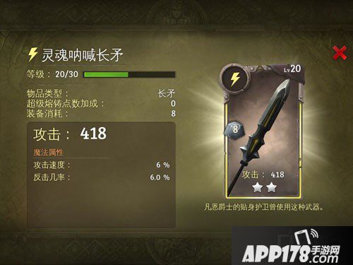 地牢猎手5光明属性武器二星长矛图鉴介绍!地牢猎手这款游戏中一共有五种属性和五种武器,每一种武器都有自己的特点,同时属性之间也有着相生相克的关系。长矛,长矛有着不错的攻防能力,各项系数都很平均,也许就是因为这样所以它的能力才显得很平庸。今天APP178手游小编就来给大家说说这款游戏中光明属性武器二星长矛图鉴,希望大家喜欢!