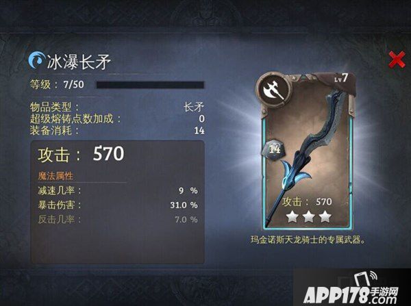 武器属性:寒冰属性。减速几率加成,暴击伤害加成,反击几率加成。