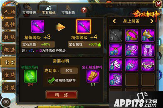 宝石镶嵌只不过是第一步,如果你想让镶嵌的宝石发挥更大作用,就要用到宝石精炼。宝石精炼会在玩家等级达到55级时开启,且只有镶嵌了宝石的50级以上装备才能进行宝石精炼。通过消耗精炼材料,玩家可提升装备上已镶嵌了的宝石,其所对应的属性。而且精炼等级越高,提升的属性百分比就越高,但成功率会相对降低。精炼成功,等级自然提升,但若精炼失败,则会掉级。不过玩家无需担心,只要使用“精炼护符”就能保证精炼失败不掉级。另外《斗破封神》的宝石精炼本身就自带保护等级,分别为7级、12级。在该等级精炼失败时不掉级,且高于该等级失败,最多掉落至该等级,不会一掉到底。