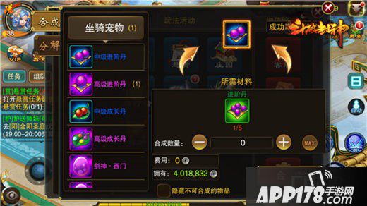 炼炉的第一个功能便是“合成”。合成,顾名思义,就是一定量的物品融合成另一种物品。合成物品根据种类不同,可大致分为:坐骑宠物、图纸合成、杂物合成、锻造强化、活动道具。点开每个大类,玩家就能看到可合成的道具列表。目前,《斗破封神》的合成模式,大致可分为两种。