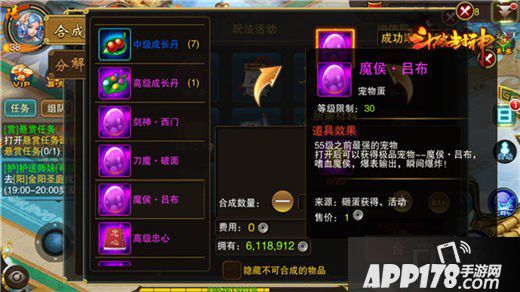 第二:材料碎片合成。如2张碧霄神兵·残页合成碧霄神兵制作书。20个宠物蛋精髓合成1个魔侯·吕布。