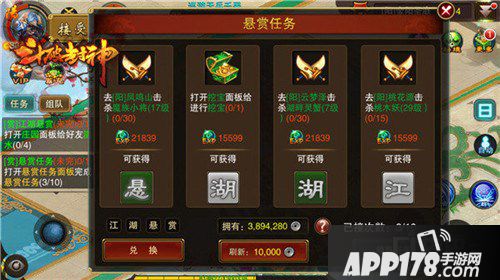 每位大侠每日可接10次悬赏任务。每完成一次都能获得相应奖励。悬赏任务分为不同品质,品质越高,奖励越丰厚。大侠们可消耗银子和道具刷新任务品质,从而让收益最大化。除此之外,每个任务都会跟“江湖悬赏”其中一个字绑定,如果能将文字收集齐,还能兑换礼包,获得惊喜好礼呦~