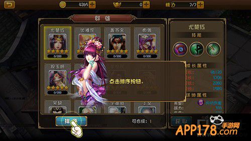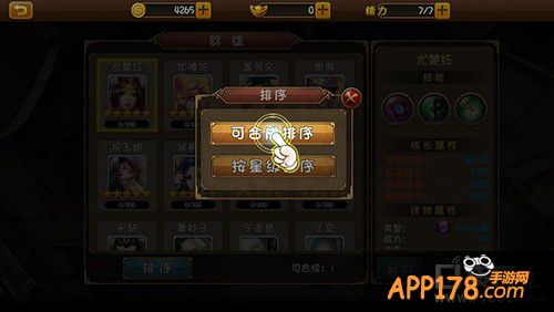 在主游戏界面上点击【群雄】进入合成画面后,点击【排序】——【可合成排序】,最后,选择要合成的【英雄头像】。
