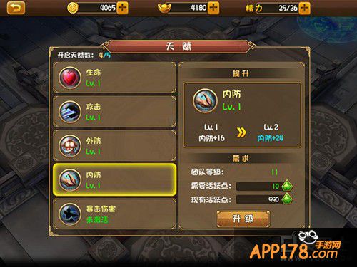 在天赋系统的界面中,可以激活的天赋种类是由玩家所带领的团队等级决定的。玩家们通过升级操作可以提升不同的天赋属性效果。小编这里要提醒各位玩家,天赋升级过程是需要消耗活跃点的。