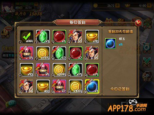 在游戏主页面的左上方有个按钮【签到】,点击签到就进入了签到系统。由上图可知:玩家如果每天进行签到,可以获得金币、莹石、杜伏威、3/5星经验卡、花煤精、精玉、元宝、泰羽石等奖励。这些奖励有些可以直接购买装备,有些可是用于英雄养成、装备强化的重要物品呢!