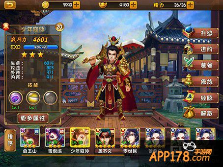 小编最喜欢寇仲,所以先选择少年寇仲进行养成,右侧依次有升级、进阶、装备、修炼、经脉、解散。