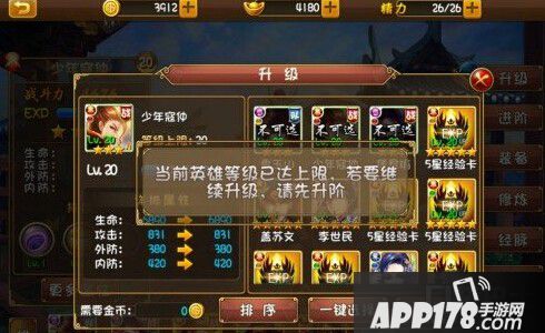 玩家在选定需要培养的英雄之后,点击【升级】,如果该英雄的等级没有达到上限,点击升级后,英雄的级别会提高;如果该英雄的等级已经达到上限,刚无法继续升级,必须先升阶才能进行英雄升级。