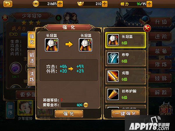 2.消耗一定的金币强化装备(可以选择一键强化把英雄装备强化到目前最高等级)