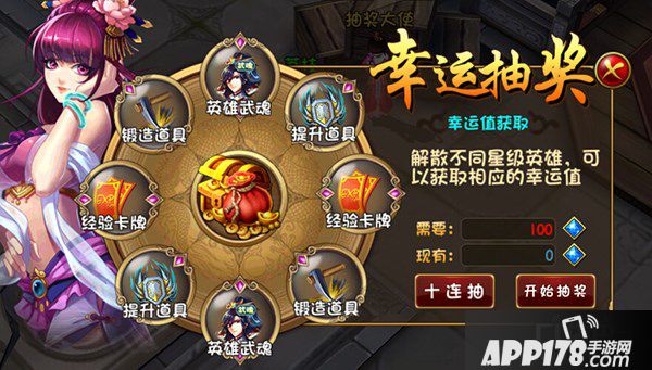抽奖需要幸运值,幸运值靠解散不同星级的英雄可以获得。抽奖可以获得英雄武魂、提升道具、锻造道具和经验卡牌。