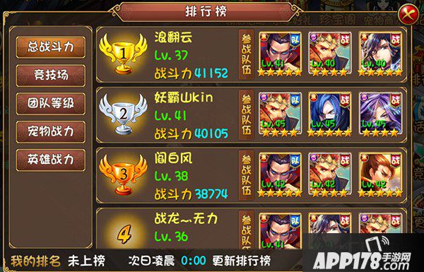 排行榜的种类:游戏中不止一个数据有排行。玩家朋友们可以在总战斗力、竞技场、团队等级、宠物战力、英雄战力等项冲级排行,榜上有名。