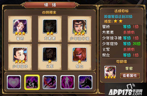 情缘难度为二颗星,达成情缘凶终隙末可以获得四星英雄李密。