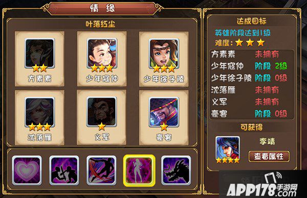 情缘难度为二颗星,达成情缘叶落红尘可以获得四星英雄李靖。
