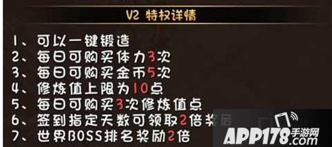 充值到V2是最合适的,为什么这么说呢,首先我们看下图V2的作用,前面的可以直接忽略,都是些购买体力金币次数上限,最后一个才是关键,打世界BOSS奖励翻倍,我们知道元宝主要来源于世界副本,若是在此利用好,一天八百难度不大。