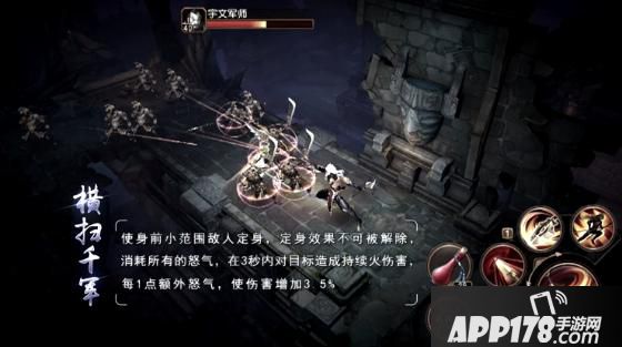 横扫千军,使身前小范围敌人定身,定身效果不可解除,消耗所有的怒气,在3秒内对目标造成持续火伤害,每1点额外怒气,使伤害增加.5%。