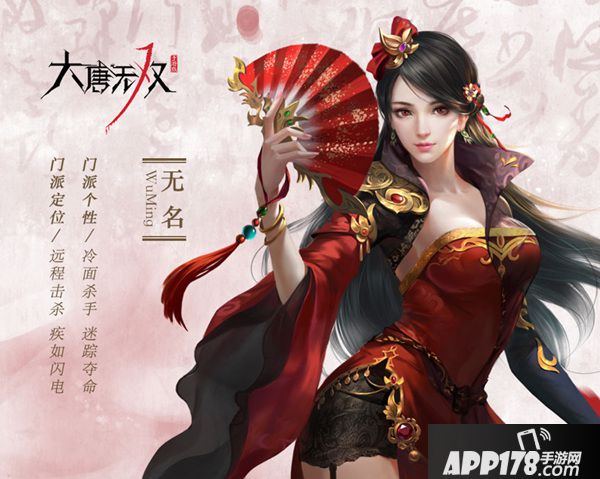 网易第一战斗网游《大唐无双》将在1月初登陆APP178手游安卓平台开启火爆公测,天煞、蜀山、无名、少林、百花门派职业,五大门派强势归来,开启热血帮派大战。应昨天论坛玩家小伙伴的要求,今天,我们聊聊无名派,门派个性冷面杀手,迷踪夺命,其门派定位是远程击杀,疾如闪电。