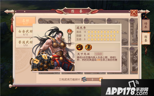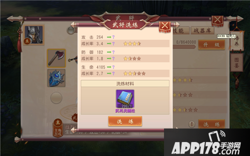 不同武将的各项属性成长率不同,若不满意,可使用“武将洗髓经”对武将进行洗练,改变武将属性成长率,从而改变对应属性值。