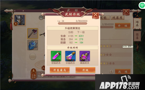使用武将经验药水可以提升武将等级,升级后会增加武将属性,但是武将等级不能超过主角等级。