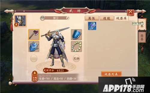 武将有特定武将战器,给武将装备战器,可以提升武将的三项基本属性,并提升武将伤害强度和伤害加成、伤害减免效果,从而使其在战斗及竞技场中的战力提升。数个低阶战器有一定几率合成高阶战器。