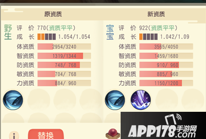 洗宝宝的界面可以选择是否替换当前的资质,这样玩家能保证洗出的资质好于现有的资质的时候才替换。