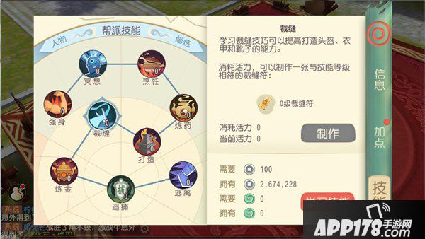 帮派技能大多是生活技能,时间充裕的可以选择烹饪、炼药、打造、裁缝、炼金中的1个或几个来学习。