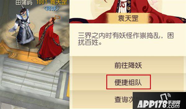 由于降妖活动是组队任务,单人不可以接取,因此点击袁天罡弹出对话界面时,我们可以选择“便捷组队”,加入别人的队伍,或者自己创建队伍。
