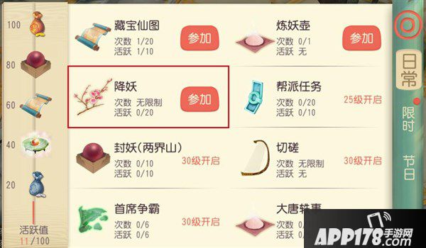 封妖30级3人以上组队野外封妖,难度比降妖高一些推荐每日完成