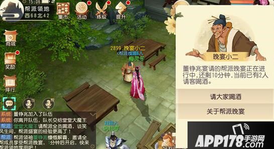 帮主或者副帮主在帮派货商处购买即可开启,期间在帮派领地的帮众均可持续获得经验,类似于人参果的提升修为,如果给帮众续酒,还可以提高晚宴经验加成哦!不摆宴席的帮主不是好帮主,是时候让帮主请吃饭啦~