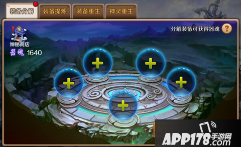 装备分解,可以获得器魂,器魂可以在神秘商店换取稀有道具哦~赶紧把你那些没用的蓝装绿装分解掉吧~还有一笔额外的收入呢!