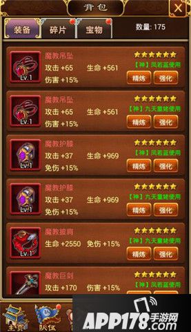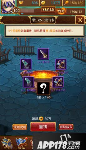 在后面级别更高的副本中,会逐渐掉落一些蓝色以上品质装备的碎片。我们要每天把这些能够掉落碎片的副本都刷一遍,以尽快拼合出完整的装备来。当玩家为每一位上阵伙伴都装备了当前能够获得的最好装备之后,就可以考虑合成装备了。在主界面的合成按钮中,我们可以把五件相同品质的装备合成为一件高一级品质的随机装备碎片。