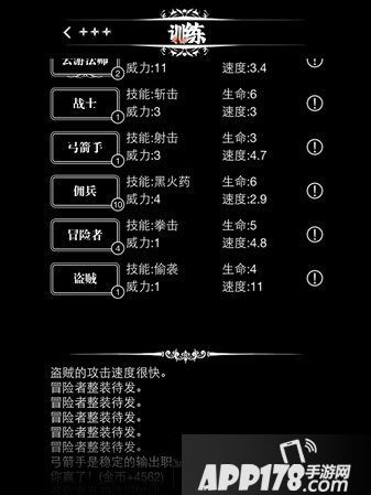 盗贼:训练盗贼获得技能偷袭,生命值为4;威力为1;速度为11。盗贼的特点为攻击力低,血量一般,速度是最快的,因此刷新技能的速度是战士的3倍左右,意味着战士攻击一次,盗贼就能攻击3次。