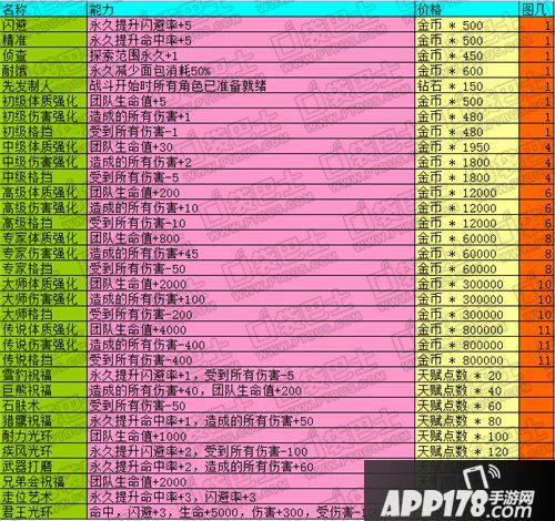 总共18个天赋,共计增加属性闪避率+14,命中率+14,团队生命+12200,造成伤害+850,受到伤害-655。