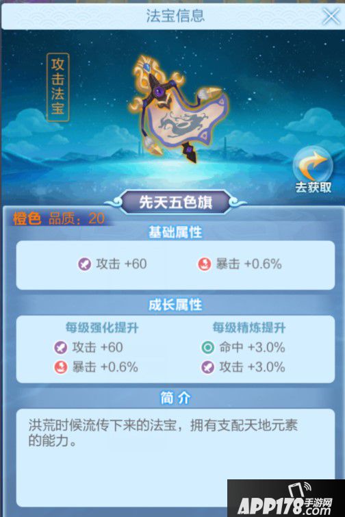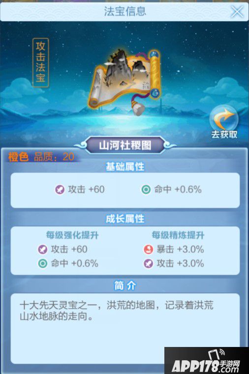不同法宝的强化属性和精炼属性也会有所差别,比如橙色法宝山河社稷图强化升级会增加固定值的攻击力和百分比的命中,则精炼之后会增加百分比的暴击和攻击,反之另一橙色法宝先天五色旗强化则提升攻击力和暴击率,而精炼提升攻击和命中率。防御型宝物则增加生命值、闪避率和抗暴率。