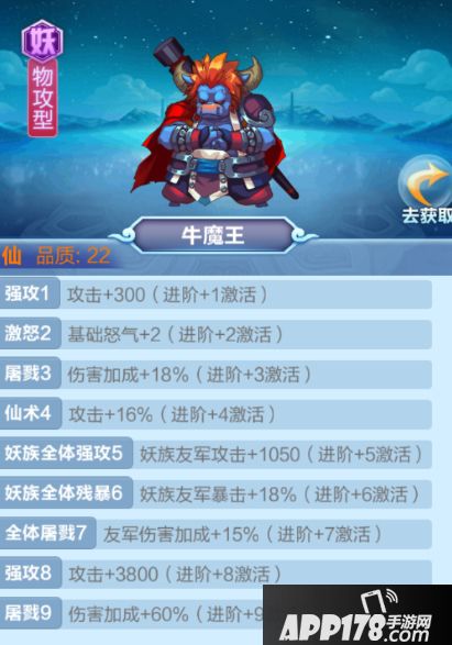 与其他种族不同,妖族的刑天本身也是很强的光环将,从进阶+5开始,全部是给予友军加成的光环,暴击、攻击、防御,应有尽有,所以玩其他种族的土豪,也可以尝试把刑天收入囊中,做一个光环将,能把阵容主将、主角的战斗力提升一个很大的层次,唯一的缺陷就是缺少了伤害加成的光环,这也是美中不足的一点,所以只是可以考虑这么做,而不是必须。妖族的优势就是本身就要上刑天,更自然地享受到光环加成。