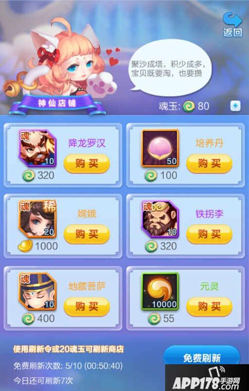 神仙店铺会出售紫、橙神仙碎片,也会刷新出培养丹、元灵、突破丹等道具,都有元宝购买和魂玉购买两种形式,魂玉可以通过日常产出和分解神仙获得。