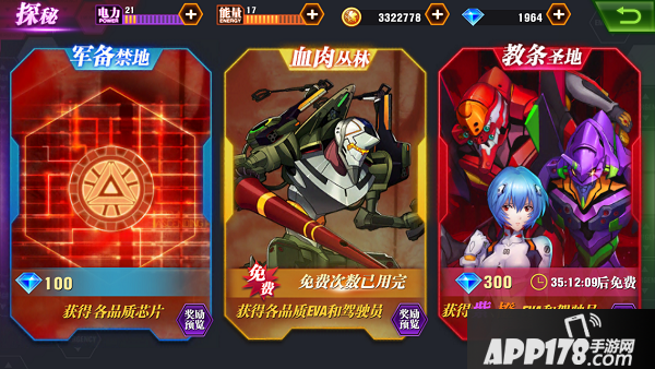要想获得橙色EVA和驾驶员,很重要的途径之一就是教条圣地十连抽。前期钻石来得快,玩家可以多几次十连抽,每次十连抽必得橙色EVA或驾驶员,几率还是很高的,缺少橙色EVA或驾驶员来撑阵容的玩家,通过几次十连抽很快就能把第一阵容给凑齐了。后期建议平民玩家将钻石用来商店购买碎片更好。土豪大R请随意。