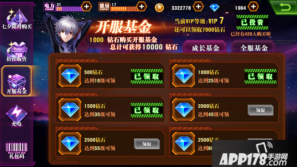 开服基金是小编认为最划算的,开服必买,只需花少量的钻石就能获得总计10000的钻石。最关键的是,全服玩家共享豪华大礼,购买人数越多,奖励越多。