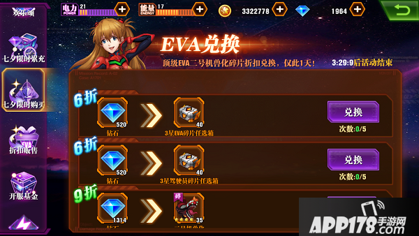 折扣贩售中各种资源打折出售,前期金币来源充足,所以小编不推荐用钻石买金币,每天点金点几次就够用了。而购买稀缺资源却是很划算的,尤其是3星驾驶员和EVA碎片宝箱。