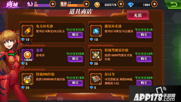 总得来说,开服基金是必买不亏的。商店中刷新购买碎片也是划算的。然后前期三四次的钻石十连抽获取橙色驾驶员和EVA撑阵容。剩下的钻石就用来每天买满电力和能量,参与各种活动。