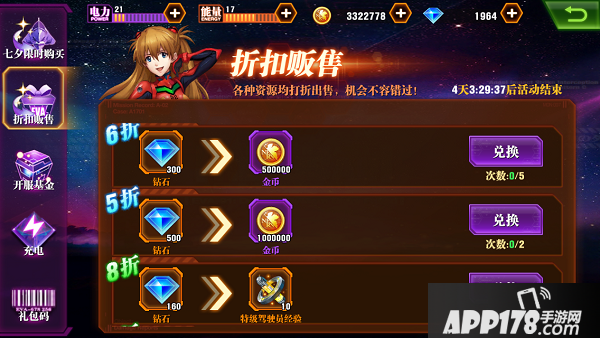折扣贩售中各种资源打折出售,前期金币来源充足,所以小编不推荐用钻石买金币,每天点金点几次就够用了。而购买稀缺资源却是很划算的,尤其是3星驾驶员和EVA碎片宝箱。