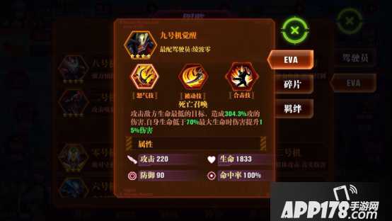 目前,对于这架新出的EVA,官方还未公布它的获取方式,不过它的技能以及属性值已经早已进入大家的视野。除了基础属性大大超出了9号机,作为9号机觉醒型机体,它的合击技能就是死亡召唤,攻击敌方生命最低的目标、造成300%以上的攻击的伤害、而且对于生命较低的敌方,还会造成额外的伤害加成。最需要注意的是,同一个eva可以有不同的属性变化,每一个eva的搭配都不是仅有的几个搭配选项,而是有很多个,这就给玩家们提供了几百种不同的搭配选择,而且每一个属性的加成都会有一段IP的故事等待大家去回忆、去发掘。就是当它与八号机、二号机兽化一起出击时,将可激活终极爆发属性,大幅度提升自身生命力和攻击力。