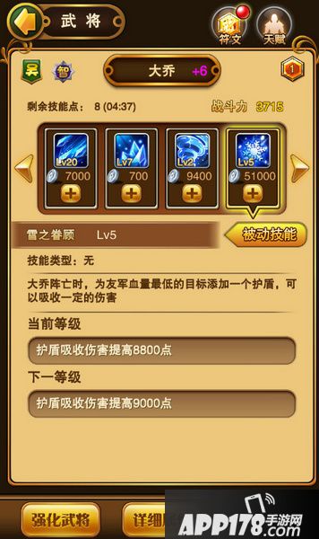 血之眷顾:大乔阵亡时,为友方血量最低的目标添加一个护盾,可吸收一定伤害,初始吸收8000点。