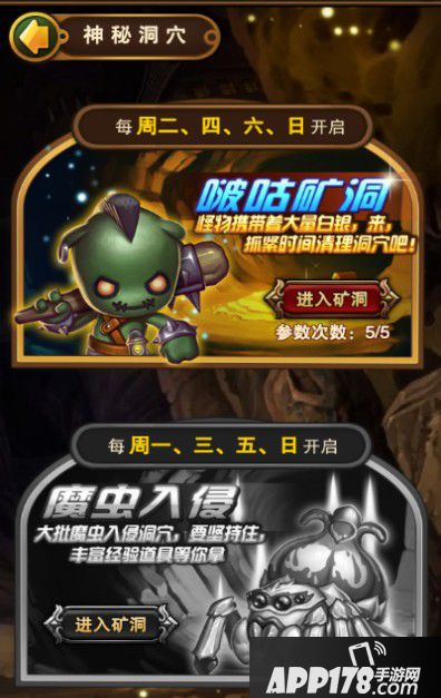 神秘洞穴是游戏中重要的特色玩法之一,分为啵咕洞穴和魔虫入侵两种玩法。周一到周六交替开启,周日全开。其中啵咕洞穴主要考验主公的杀怪数量,魔虫入侵则主要考验主公的生存能力。