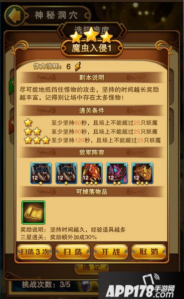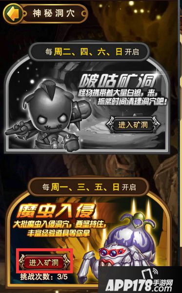 在主界面左方神秘洞穴图标可进入,在周一、三、五、日开启的魔虫入侵副本可获得大量经验哦。