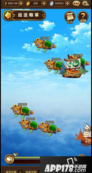 军粮护送是目前游戏中少有的PVP玩法之一。主公等级达到28级后开启,既可以自己运送,也可以通过抢夺其他主公来获得收益。每天每个主公可以护送2次飞船,可以协助军团成员进行护送4次,抢夺他人飞船4次(同样每天5点刷新次数)。