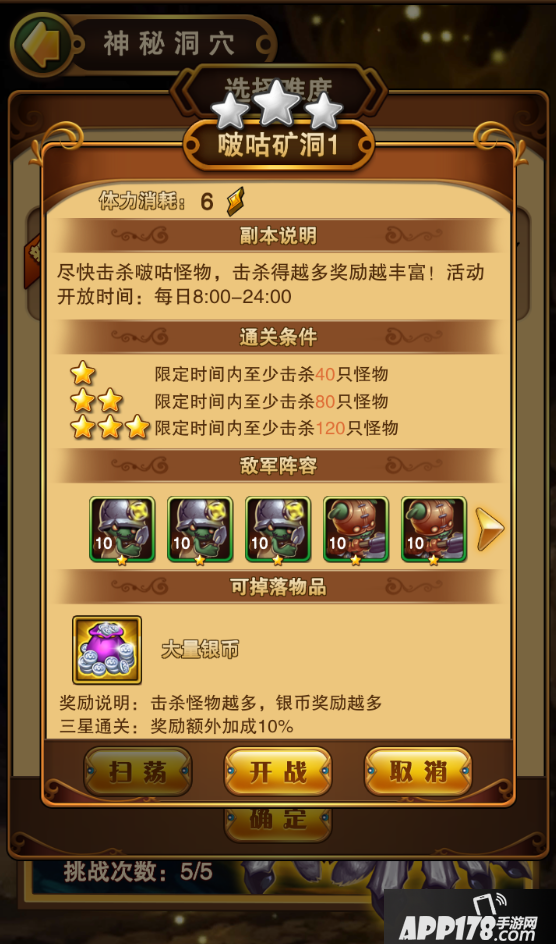 啵咕矿洞的核心玩法就是在限定时间内击杀怪物越多,获得的银币奖励就越多,三星通关即可获得额外银币加成10%。