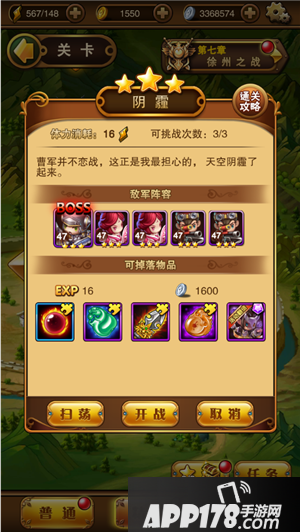 1,如下图所示,通关精英关卡就有几率获得武将魂石,但是这个关卡是有次数限制的,而且消耗的体力也比普通关卡多,所以不要急于求成不停用金币刷新关卡和购买体力哦。