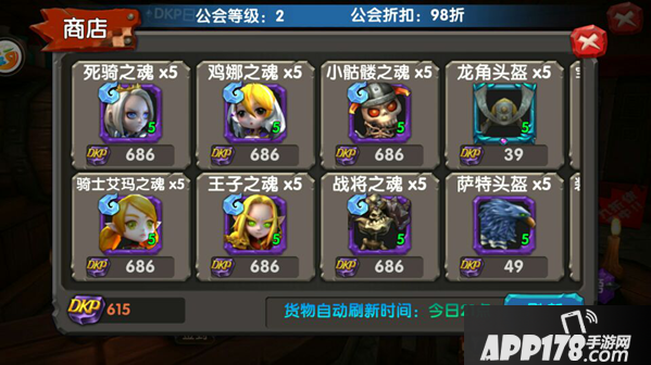 公会商店里面可以根据个人DKP来消费,兑换角色灵魂、装备升级材料以及装备进阶等材料。公会商店可以通过系统特定时间自动刷新,或者使用钻石来刷新里面的道具。